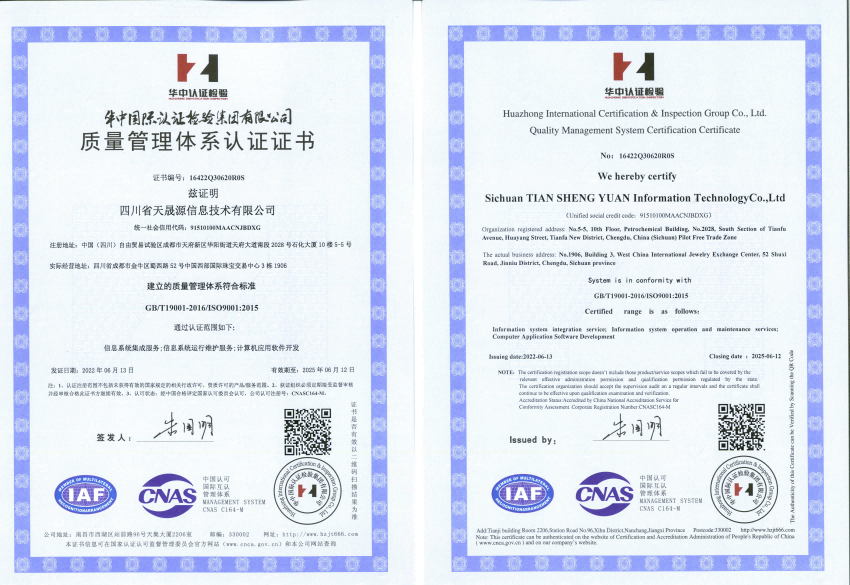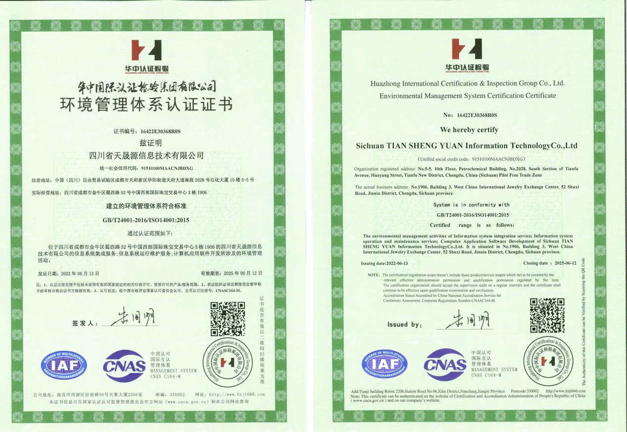 祝賀天晟源環(huán)保信息子公司獲得三體系認證證書和信息安全管理體系認證證書