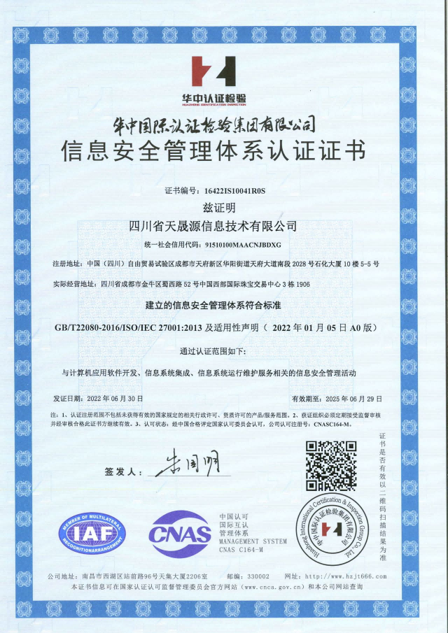 2022630日,四川省天晟源信息技術(shù)有限公司(簡稱“信息子公司”)順利通過了信息安全管理體系認證的專項審核,正式獲得質(zhì)量管理體系GB/T19001-2016/ISO 9001:2015)、環(huán)境管理體系GB/T24001-2016/ISO 14001:2015、職業(yè)健康安全管理體系GB/T45001-2020/ISO 45001:2018和信息安全管理體系GB/T22080-2016/ISO/IEC?27001:2013四項認證證書,這標志信息子公司信息系統(tǒng)集成、信息系統(tǒng)運行維護計算機應(yīng)用軟件開發(fā)方面的規(guī)范化、標準化和信息安全管理水平達到新的高度。