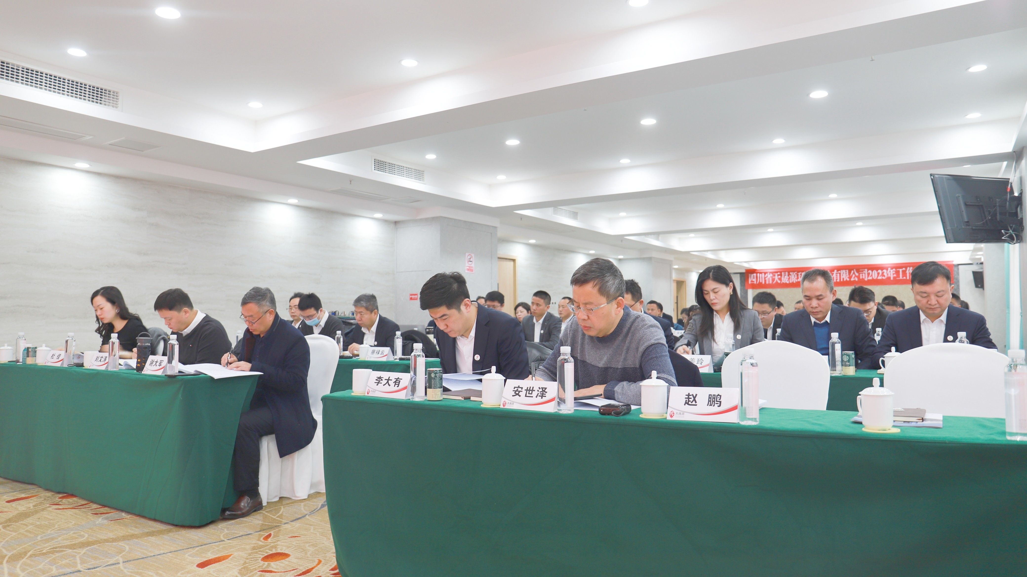 四川清新環(huán)境科技有限公司總經(jīng)理,天晟源環(huán)保董事趙鵬希望大家加強(qiáng)工作中的目標(biāo)管理,正確面對改革過程中的陣痛,同時(shí)衷心祝愿公司發(fā)展蒸蒸日上;原四川省地質(zhì)工程勘察院集團(tuán)有限公司董事長、總經(jīng)理,天晟源環(huán)保董事長安世澤蒞臨會(huì)議現(xiàn)場并致辭,他鼓勵(lì)天晟源環(huán)保保持現(xiàn)有發(fā)展勢頭,在雙方股東帶領(lǐng)下繼續(xù)優(yōu)化企業(yè)戰(zhàn)略、拓展專業(yè)領(lǐng)域、深挖存量市場、延伸產(chǎn)業(yè)鏈條、加強(qiáng)技術(shù)支撐;天晟源環(huán)保董事長李大有代表公司感謝雙方股東一年來的信任與支持,幫助公司走過了真的不一般、真的不容易的一年。他表示,公司將在2024年堅(jiān)定理想信念,懷揣發(fā)展的恒心、開拓的信心、改革的決心、通達(dá)的耐心,以資本、實(shí)業(yè)、技術(shù)這“三駕馬車”帶動(dòng)公司向上市目標(biāo)全速前進(jìn)。